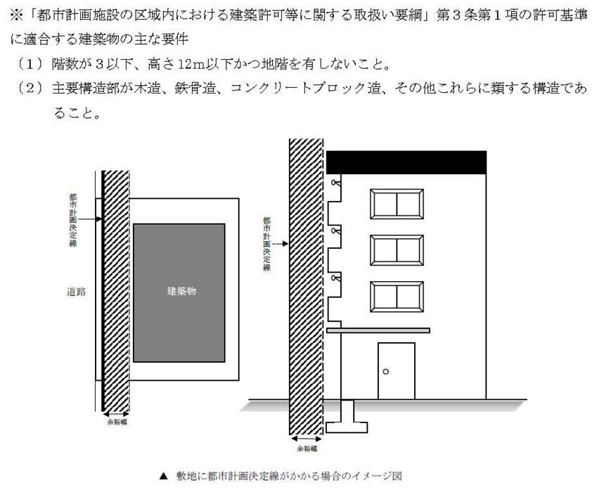 1mの余裕幅を設定しています。つきましては、建築計画をする上で、特に許可基準※に適合しない建築物(RC造など)は、